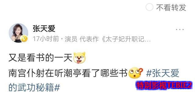 张天爱称剧中南宫“又是看了一天书”,看似既辛苦又乏味,满心期待南宫重出江湖。张天爱还称,南宫仆射被评为天下第一美,其实她的目的是在武学修为上成为天下第一。