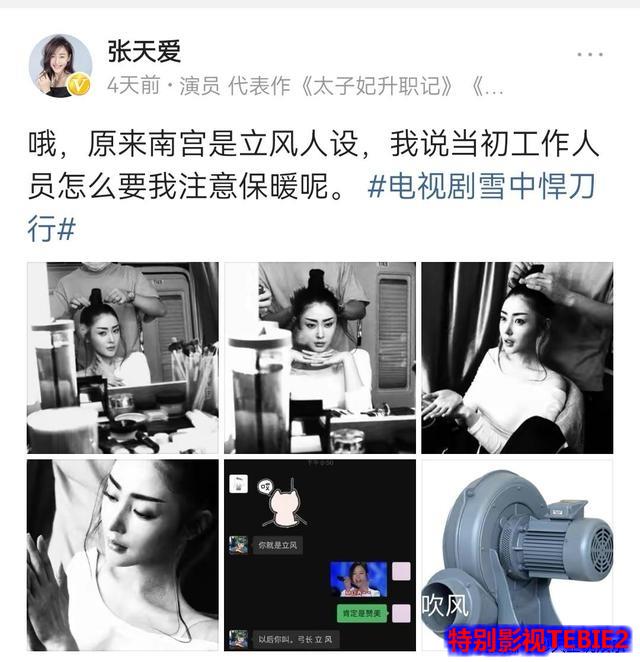张天爱称剧中的南宫仆射是立风人设,拍摄时鼓风机的使用相当多,曾有工作人员提醒她注意保暖,这也算是对网评南宫又慢又飘的一个回应。