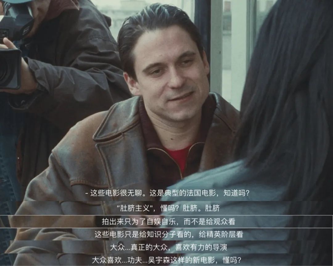 影片中的这名记者,自称非常喜欢好莱坞电影和香港的商业动作片,却对雷奈所代表的法国艺术电影非常厌恶,极尽讽刺地称之为“过气”的失败之作,甚至还说出“那些知识分子扼杀了电影工业的发展”这样的言论。